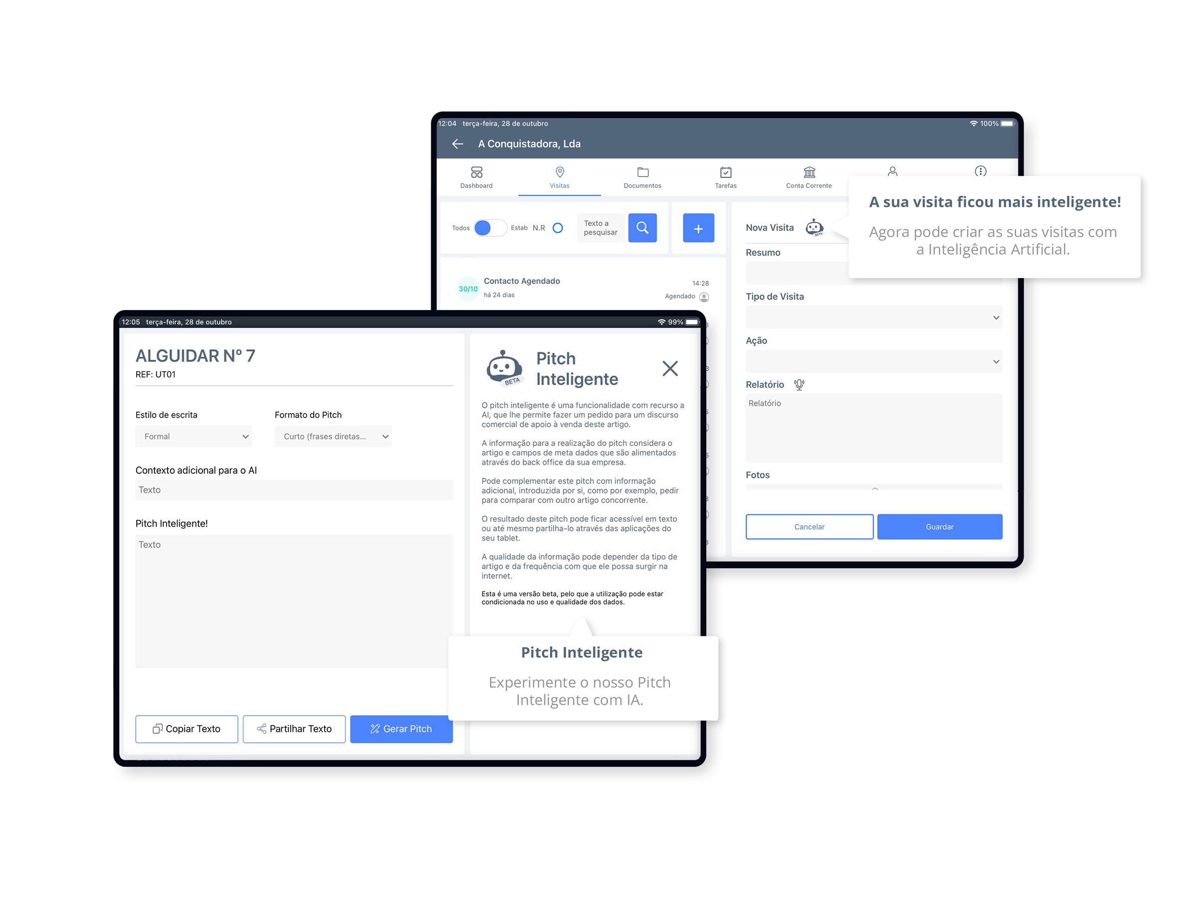 Registe os relatórios de visitas nos seus Clientes ou Potenciais, não perca detalhes para a próxima visita, ou aceda a visitas lançadas na empresa e dê seguimento agora com assistência por AI que automatiza a transcrição e organização das informações.