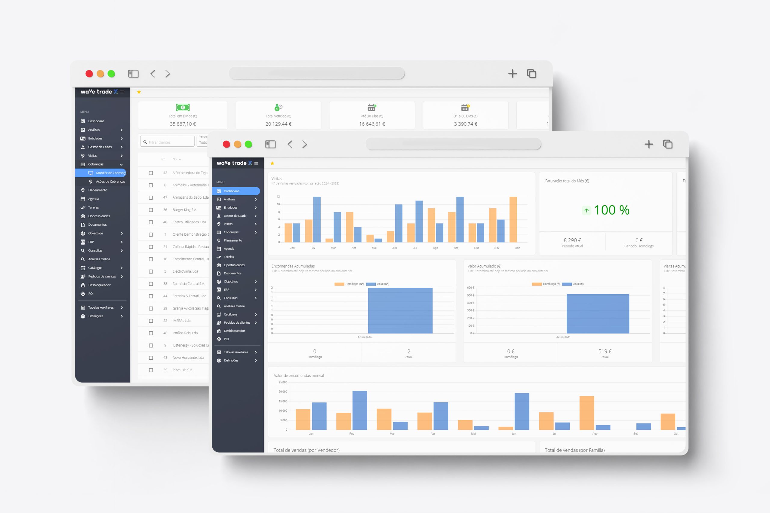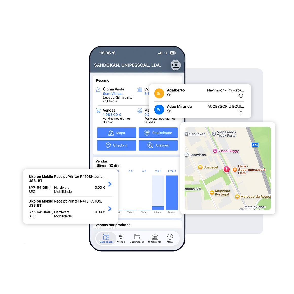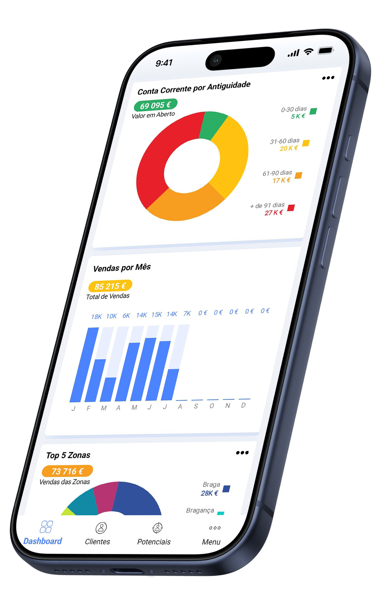A aplicação inclui vários módulos — como Dashboard, Clientes, Potenciais, Entidades, Objetivos, Gestão de Catálogo, Otimização de Rotas, entre outros — que permitem monitorizar e acompanhar em tempo real a atividade e o desempenho de toda a equipa comercial.